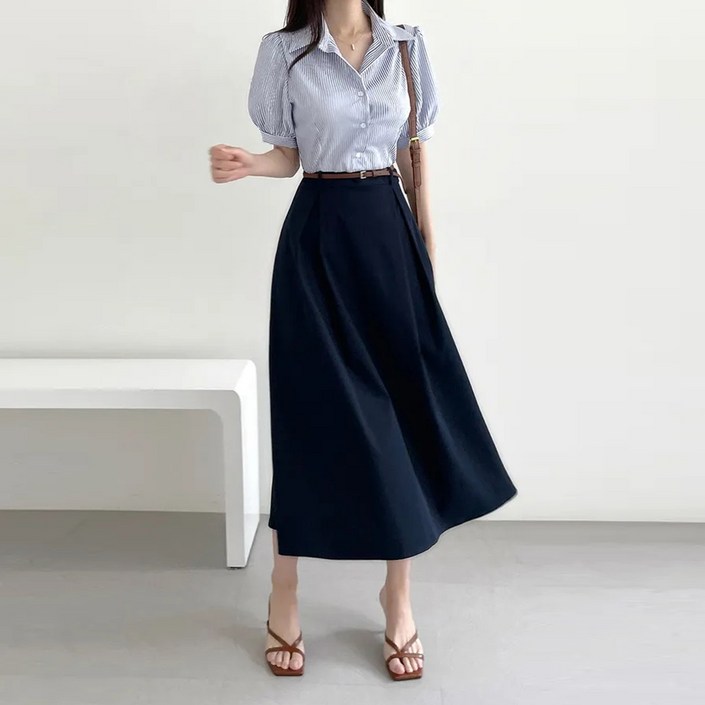 반팔 배색원피스 롱 데일리 아나운서 카라 원피스 결혼식 하객룩 벨트원피스