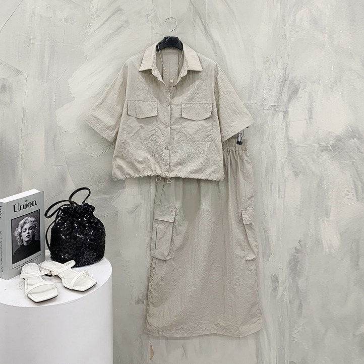 행복여 다이프 포켓 카라 셔츠 밴딩 스커트 세트