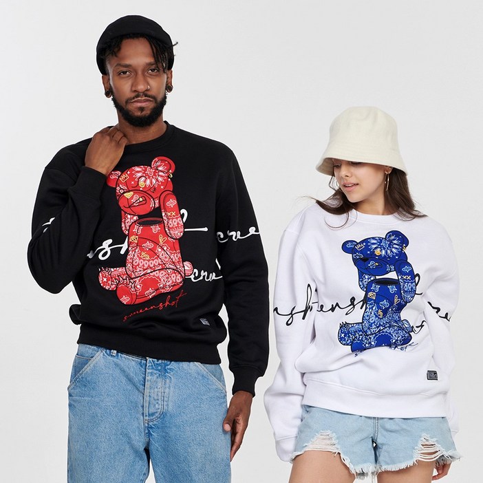 무니크영 F1122 남녀공용 빅사이즈 프린트 자수 패치 오버핏 페이즐리 패턴 베어 맨투맨