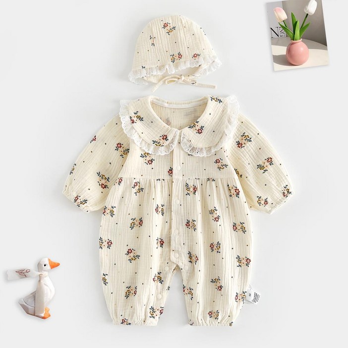당일발송 아기 신생아 여아 레이스 카라 잔꽃 바디슈트 보넷 모자 세트 외출복